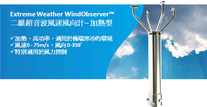 Weather WindObserver™ 超音波風速風向計,在寒冷的天氣中能保持不結冰。 高加熱功率,量測風速可達75 m/s,非常適用於極端條件下。