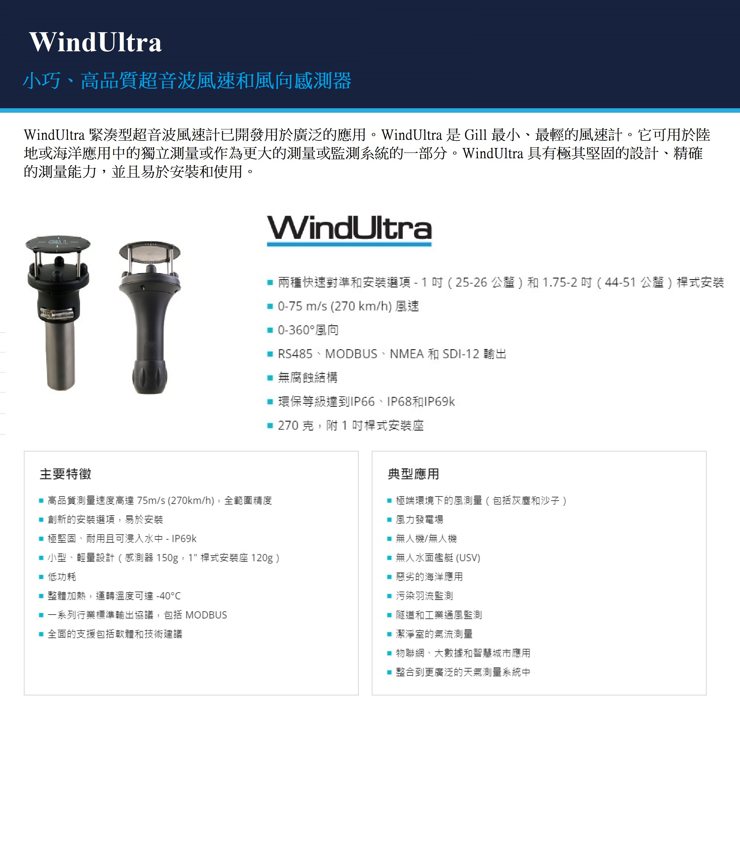 WindUltra™ 超音波風速計由英國 Gill Instruments設計製造,能夠準確、可靠地測量風速和風向。 WindSonic™ 是雙軸超音波風速風向計,經由一個串列或兩個類比輸出提供風速及風向數據。 要確認操作的正確性,訊號輸出會與儀器的狀態碼一起傳輸。