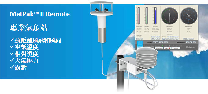 MetPak™ II Remote 氣象站MetPak™ II Remote 是一款小巧輕便的多參數感應器儀器,搭配遠距離 WindSonic 風速風向計,可在距離 MetPak II 集線器達10公尺量測風速。 WindSonic 風速風向計適用於安裝在10公尺高桅杆,與安裝於地面上1.25~2公尺高的主 MetPak II 集線器安裝配置。(氣象觀測儀器與方法指南)。系統包含10m訊號線,連接至 MetPak™ II 集線器可隨時連接至 WindSonic 風速風向計。 MetPak™ II Remote 氣象站提供 MetSet 設定軟體和 MetView 顯示軟體: