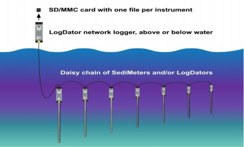 線上:水底沉積剖面儀可以利用電纜連結水面上電腦。在RS485網路可以分享同一條電纜線支配數百台儀器。這電腦控制量測時間和處理資料的儲存。它也可以從網際網路的Web-server上,即時得到結果。為量測正在活動的環境影響,其解決方案擁有清楚的成本利益和減少風險的優勢。客製的電纜線是需要的,可在水下連接沉積剖面儀。