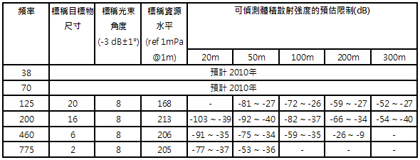注意 ‧訊號的副瓣(sidelobes)是-17dB或更好 ‧可偵測體積強度限制在+/- 3~4 dB ‧4個可選擇增益設定值允許使用者以6dB增量改變全系統增益。 ‧時變增益範圍是80dB ‧以上規格如有變更,恕不另行通知