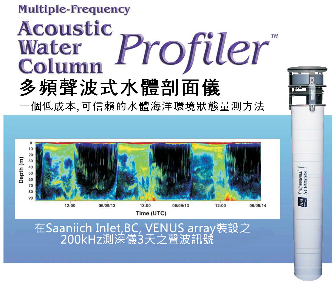 應用 聲波水底剖面儀可以在水體裡透過量測聲波式回音之超音波頻率去監測浮游生物的存在與豐富性。 從聲納回音訊號資料得知其他聲納目標物,包括魚和懸浮沉積物。 這是科學研究和海洋、湖泊與河川環境監測有力的工具。 特徵 ‧可以在連續收集資料達數個月 ‧單一感應器箱內可以使用4個頻率 ‧可以底碇方式架設、向上監測模式或從浮標向下監視模式來運作