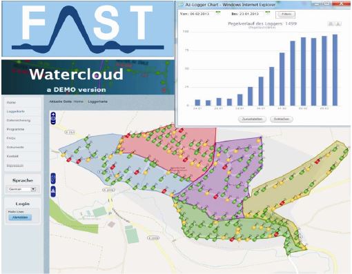 Water-cloud 當以聲波蒐尋管道的裂痕或破裂處,習慣上應用數據紀錄器來記錄數據,以便紀錄夜間低消耗的噪音。因為洩漏偵測本身是非常耗時且成本花費上須沿特定管段步行或是駕車行駛,沿途以資料紀錄器進行資料收集。因此驅策F.A.S.T GmbH開發出一套資料紀錄器傳輸的方法。應用發射收發器與GPRS模組將數據傳送到所謂的Water-cloud軟體內。此外,由資料紀錄器內新的相關函數同時校正管線破裂位置。這不僅節省了工作時間,還允許實地檢測管道破裂時能有及時補救程序。 數據紀錄器應用於整個管線網路。為達到可視化目的,建議將數據紀錄器以300-400米間隔作安裝。現有的管線圖或是路線圖可以上傳至Watercloud和資料紀錄器,該紀錄器從閥門發射出一個無線電信號傳送至一個所謂的發射與接收站(T/R station),再以點對點的方式將資料傳送至第二個發射與接收站。那麼第二個發射與接收站繼續將數據資料傳送給下一個發射與接收站。最後一個的發射與接收站,接收了所有的數據資料,並通過GPRS將數據傳送至Water-cloud。 如果紀錄器或是發射與接收站發生故障情形,其餘紀錄器將開始獨立尋找替代數據傳輸的管道,同時回報有缺陷的紀錄器或是發射與收發站給營運管理者。