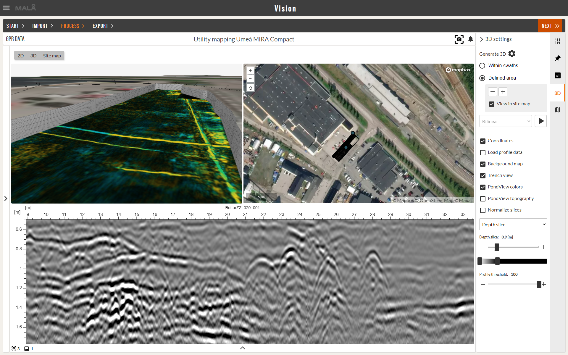 MIRA VISION可支援陣列數據三維數據投影並對已收集之多頻道透地雷達資料進行圈選註解。此外MIRA VISION支援AI人工智慧管線自動判釋模組及輸出測線與多種格式匯出。