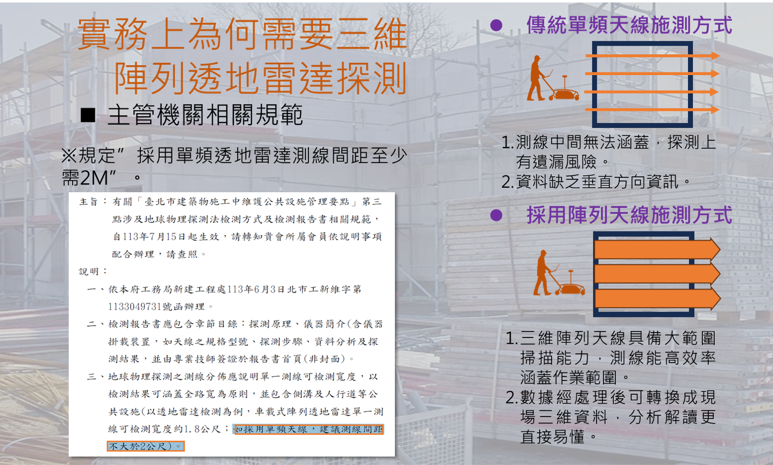 對於大型計畫或大範圍探測需求,相較於傳統單頻透地雷達,陣列產品初期雖需投資較高費用,但仍為最具經濟效益的探測解決方案。