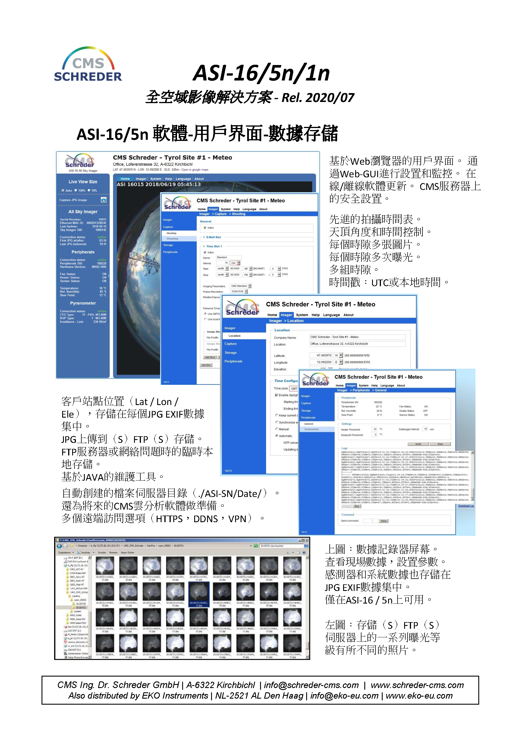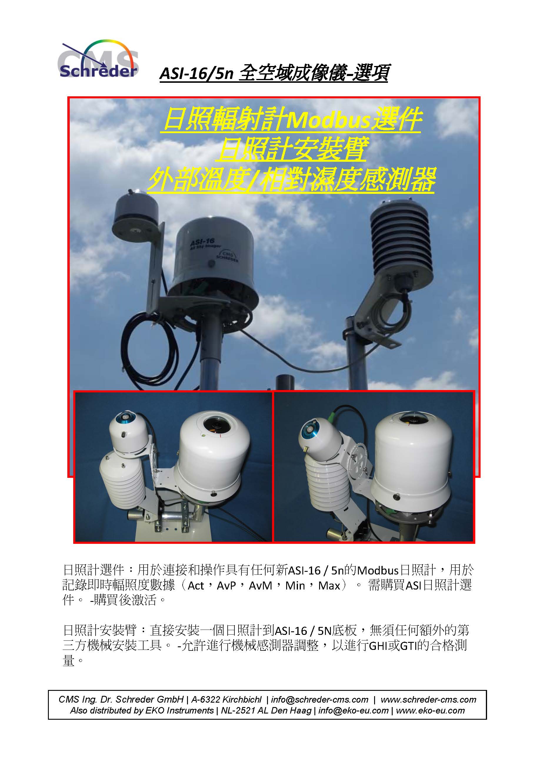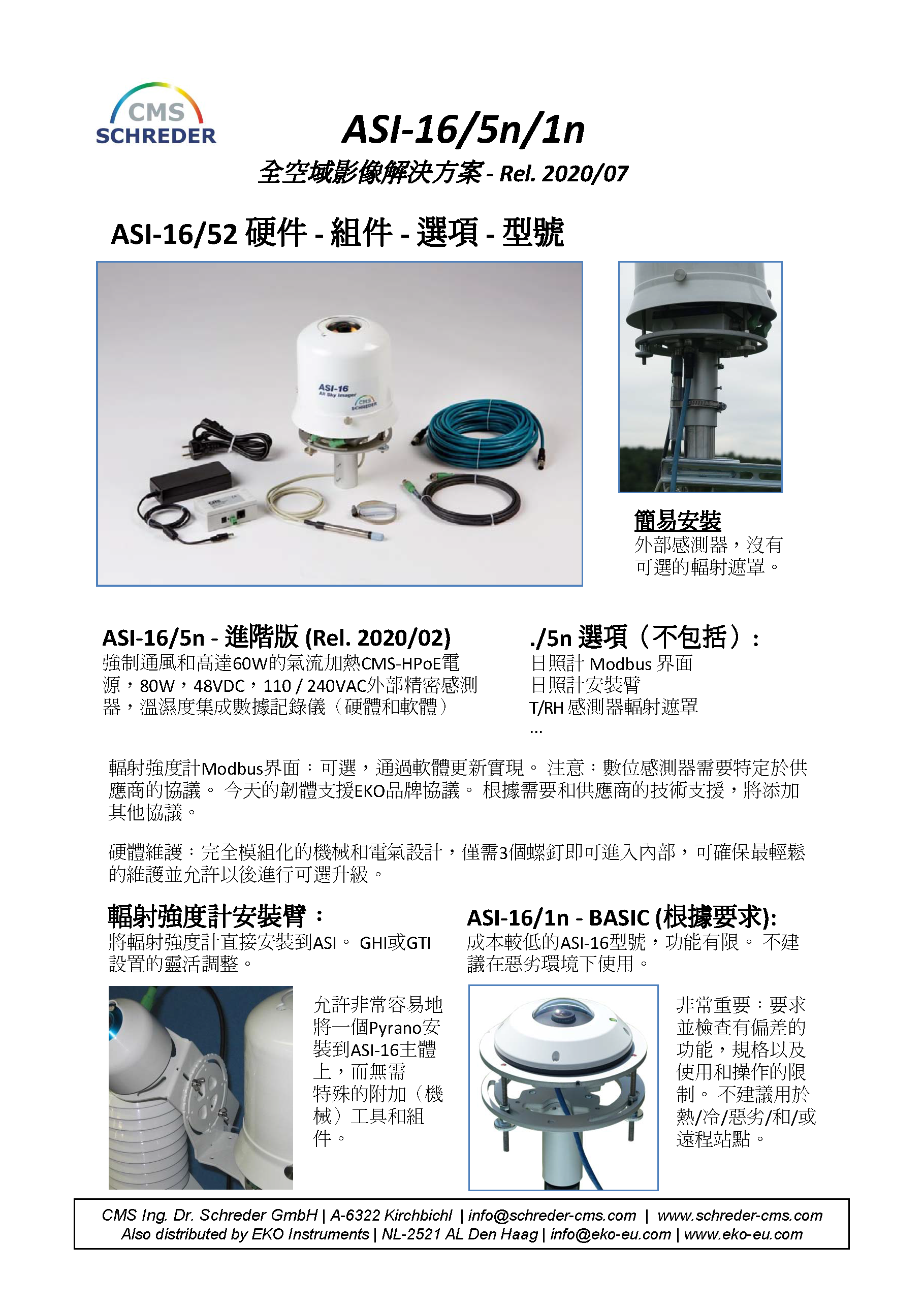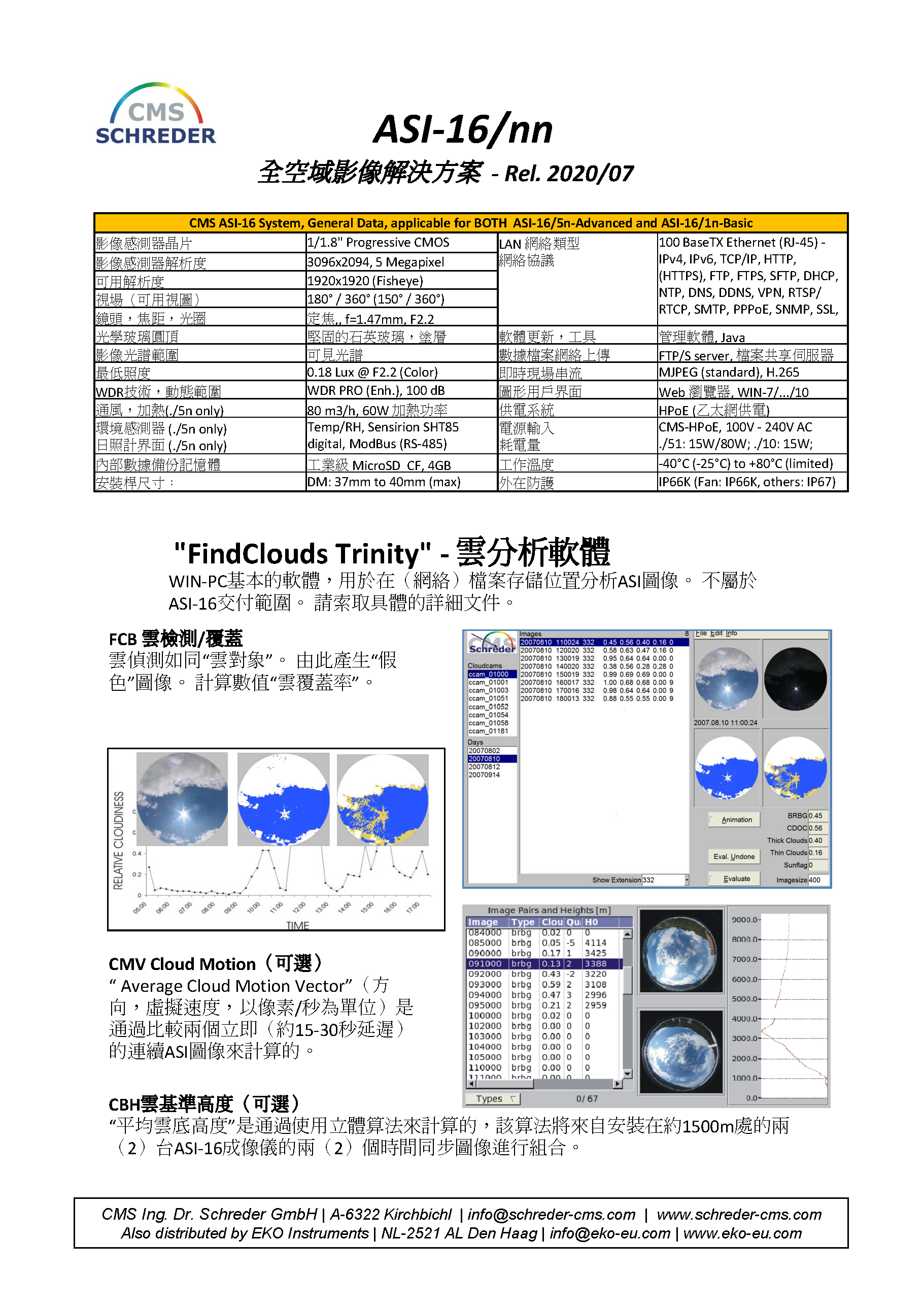 ASI-16是一款自動全雲覆蓋與雲高影像偵測系統。它代表了大氣科學和太陽能專業人士做現場評估,監測和預測。它提供了及時的彩色總天空數據(180°視角)。雲量和雲高由軟體FCT 對所存儲的數據進行後處理計算。